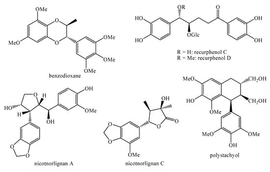 Moreover, nicotnorlignan C, recurphenol C, recurphenol D, benzodioxane (Figure 19) and sequirin C (Figure 7) and possess moderate activity against the anti-tobacco mosaic virus with inhibition rates equal to 14.7%, 22.5%, 23.4%, 21.4% and 17.6% respectively []. Nicotnorlignan A (Figure 19) also shows similar effects [].