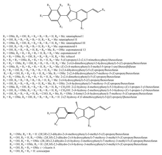 - Castro, J.C.M.; Silva, M.S.; Cortes, S.F.; Lemos, V.S. Inhibitory Effect of the Norlignan 2-(2′-hydroxy-4′,6′-dimethoxyphenyl)-5-[(E)-propenyl]benzofuran from Krameria tomentosa on Acetylcholine-Induced Relaxation of the Rat Aorta. Planta Med. 2006, 72, 78–81. [Google Scholar] [CrossRef]