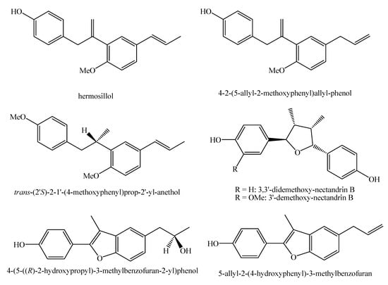 Homoegonol and egonol (Figure 3) exhibit strong effects against Candida albicans, Cladosporium sphaerospermum and Staphylococcus aureus with MIC values equal to 10, 5 and 10 μg/mL, respectively for the former compound, and 12, 10 and 10 μg/mL respectively for the latter compound. Indeed, egonol (Figure 3) and homoegonol (Figure 3) exhibit lower effects only against Candida albicans and Staphylococcus aureus with MIC values equal to 15 and 15 μg/mL, respectively for the former compound and 20 and 20 μg/mL, respectively for the latter compound [].