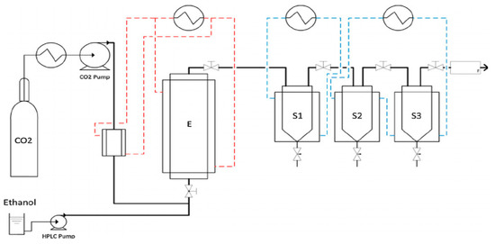 Fluid extraction and fractionation unit schematic drawing. E: Extractor; S1, S2, S3: Separators [34].