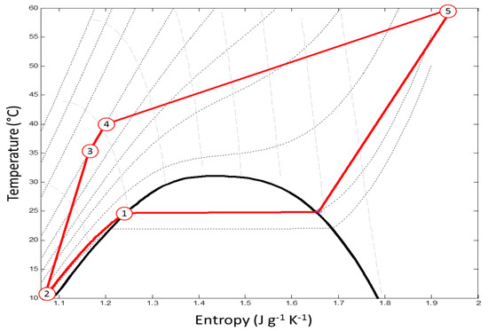 Entropy (s) diagram of CO2 cycle during supercritical fluid extraction. Circled number 1 represents saturated liquid at 25 °C and 64 bar; 2 is pump inlet (10 °C and 64 bar); 3 is pump exit (35 °C and 220 bar); 4 is extraction vessels (40 °C and 220 bar); 5 is separation vessel (60 °C and 60 bar).