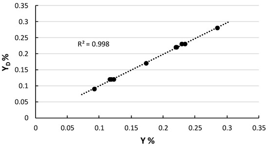 Experimental design yield (YD) versus experimental yield (Y).