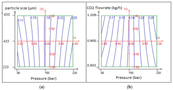 For a better understanding of the statistical results, Figure 4 represents the 2D response surface of the experimental yields by the function of pressure, average particle size and the flow rate of CO2. As can be observed in Figure 4, the highest yield was obtained around the maximum point of pressure (P = 220 bar) when the flow rate of CO2 and average particle size were around minimum points.