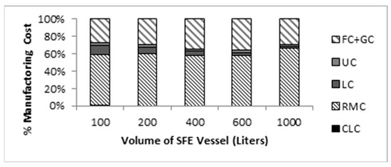 The extractor geometry data and the installed supercritical extraction cost were obtained from Núñez and del Valle [58,59,60]. In fact, a plant with two extraction vessels, each one having internal volume varying between 0.2, 0.4, 0.6 and 1.0 m3, was evaluated. For instance, for a plant with vessels of 1.0 m3, the aspect ratio was H/d = 8 (with 0.542 m × 4.334 m of inner diameter and height respectively). The wall thickness withstands 390 bar. The fixed cost of investment (FCI) of each SFE unit was determined in USD based on the values of Rocha-Uribe et al. [59]. All the values are reported in Table 3 and are calculated using the Chemical Engineering Plant Cost Index (CPECI) value for 2014 (CPECI 2014 = 580) [61].