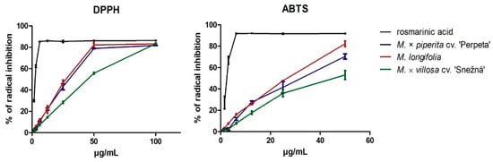 ABTS Scavenging Assay: ABTS radical scavenging assay was determined according to Re et al. (1999), with slight adaptations [44]. Briefly, 7 mM of 2,2′-azinobis-(3-ethylbenzothiazoline-6-sulfonic acid) (ABTS, purity ≥ 98%, Sigma-Aldrich, St. Louis, MO, USA) aqueous solution was mixed in equimolar ratio with 2.45 mM of K2S2O8 (purity ≥ 99.0, Sigma-Aldrich, St. Louis, MO, USA), allowing the mixture to stand in the dark, at room temperature, for 24 h before use. After radical stabilization, the ABTS solution was diluted with ethanol (1.1 mL), to a final volume of 50 mL. Mint sample dissolved in deionized water or rosmarinic acid dissolved in ethanol (2.5 µL, 1.56 µg/mL–0.1 mg/mL) was added to the ABTS solution (247.5 µL). Changes in absorbance were measured in 96-well Greiner UV-Star microplates (Greiner-Bio One GmbH, Germany), a with Tecan Infinite M200 microplate reader (Tecan AG, Austria), after 6 min, at 734 nm. All measurements were done in quadruplicate.