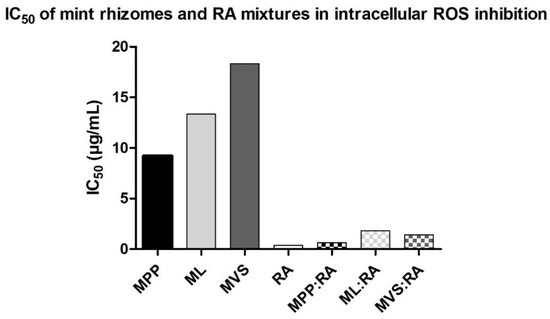 IC50 (µg/mL) of Mentha rhizomes extracts (MPP—Mentha × piperita cv. ‘Perpeta’, ML—Mentha longifolia, MVS—Mentha × villosa cv. ‘Snežná’, RA—rosmarinic acid, and their mixtures in the intracellular ROS inhibition in NIH/3T3 cells, using DCFH-DA assay. IC50 and r values (MPP = 0.99, ML = 0.99, MVS = 0.98, MPP:RA = 0.97, ML:RA = 0.95, MVS:RA = 0.96) were calculated by using CompuSyn software, n = 4. r value: the conformity parameter for the goodness of fit to the median-effect principle (MEP) of the mass-action law. It is the linear correlation coefficient of the median effect plot, where r 1 indicates perfect conformity.