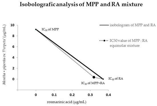 Illustrative isobologram of MPP:RA mixture at 50% effect dose level, (MPP—Mentha × piperita cv. ‘Perpeta’; RA—rosmarinic acid).