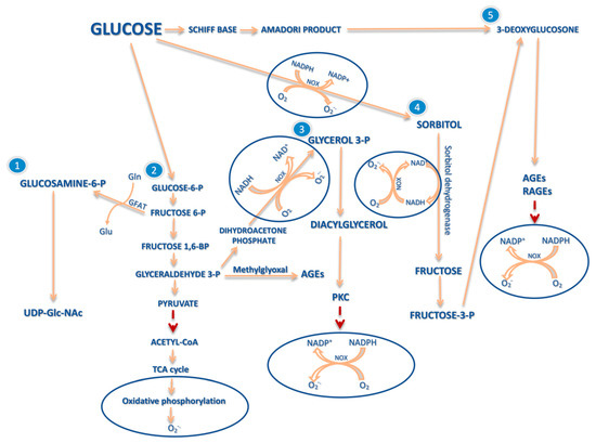 Activation of the hexosamine pathway, the third of the mentioned pathways, causes accumulation of nucleotide sugar—Uridine diphosphate N-acetylglucosamine (UDP-GLC-NAc) and its oxygen derivatives. UDP-GLC-NAc leads to pathological expression of transforming growth factor-beta (TGFbeta1) genes [37].