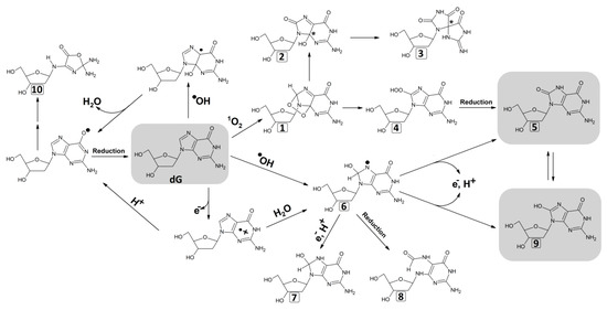 Generation of 8-oxo-7,8-dihydro-2′-deoxyguanosine and 8-Hydroxy-2′-deoxyguanosine [61]. 2′-deoxyguanosine (dG), 4,8-endoperoxide-2′-deoxyguanosine (1), 4R/4S 4-Hydroxy-8-oxo-4,8-dihydro-2′-deoxyguanosine (2), 4R/4S spiroiminodihydantoin nucleoside (3), 8-Hydroperoxy-2′-deoxyguanosie (4), 8-oxo-7,8-dihydro-2′-deoxyguanosine (5), 8-Hydroxy-7,8-dihydro-2′-deoxyguanosyl radical (6), 7-Hydro-8-Hydroxy-2′-deoxyguanosine (7), 2,6-diamino-4-Hydroxy-5-formamidopyrimidine (FapyGua) (8), 8-Hydroxy-2′-deoxyguanosine (9), oxazolone (10).