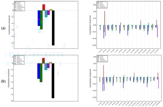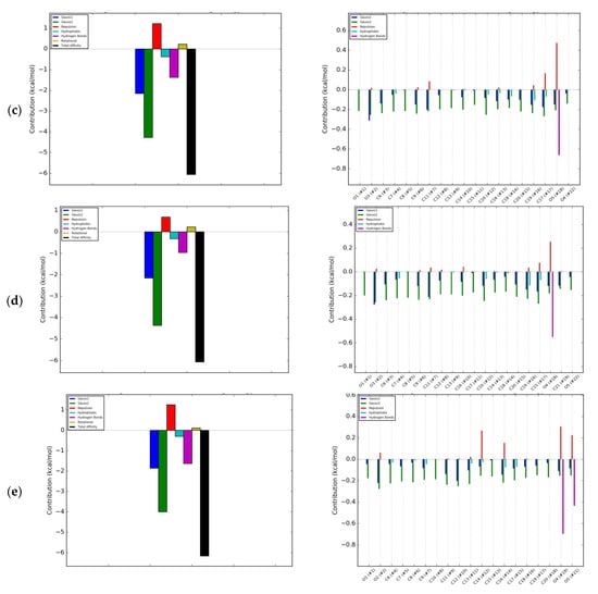 Energetic contributions to binding energy of RANKL and: (a) Daidzein; (b) Formononetin; (c) Genistein; (d) Biochanin A; (e) Coumestrol; blue bar—Gauss 1 interactions; green—Gauss 2 interactions; red—Repulsion; light blue—Hydrophobic interaction; magenta—Hydrogen bonds; olive—Rotational; back—Total affinity.
