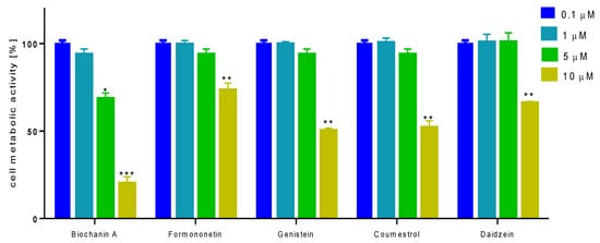 To check the influence of selected isoflavones on bone mineralization process under in vitro conditions we used human osteosarcoma Saos-2 cell line, which exhibits osteoblastic properties with high levels of alkaline phosphatase (ALP) activity [26,27]. Due to the fact that in the presence of mineralizing conditions cells undergo differentiation to osteocytes in terms of morphology and genes expression, first we studied the effect of isoflavones concentrations from 0.1 to 10 µM on cellular viability after 14 days incubation. As is presented in Figure 5, the metabolic activity decreased with increasing compounds concentrations starting from 1–2.5 µM. The highest influence on metabolic activity revealed biochanin A, the lowest influence on cells viability showed formononetin. The IC50 values, described as the chemical concentration required to reduce cellular activity to 50% of the control, are summarized in Table 2. According to IC50 values, the cytotoxicity of studied isoflavones ranked as follows: biochanin A > genistein > coumestrol > daidzein > formononetin.