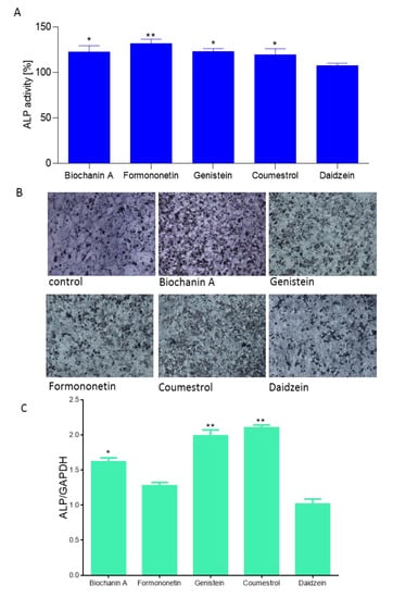 Cells incubation in the presence of ALP substrate BCIP/NBT allowed their staining and imaging with bright-field microscopy (Figure 6B). Increased ALP activity correlated with ALP gene expression elevation at the transcriptional level (Figure 6C). Saos-2 cells treated with biochanin A, genistein and coumestrol demonstrated a 1.6, 1.9 and 2.1-fold increase in ALP mRNA expression relative to vehicle-treated control cells (normalized to 1.0), respectively. Formononetin and daidzein had no influence on the ALP mRNA expression level. Daidzein seemed to have slight influence on ALP protein activity, as well as its transcriptional level. Contrary results obtained for formononetin suggest that in the presence of formononetin enhanced activity of ALP protein results from post-transcriptional, post-translational or potential epigenetic mechanisms.