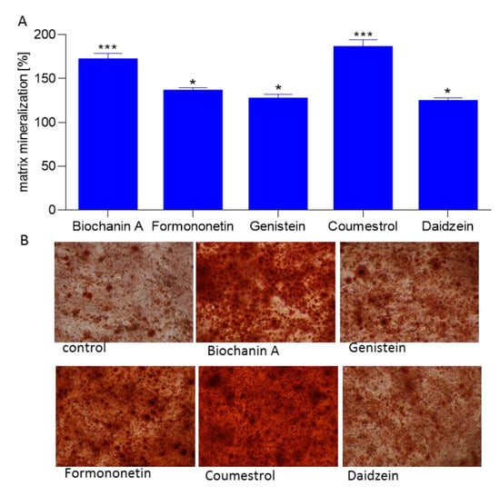 Further, the ability of isoflavones to generate calcified extracellular matrix was confirmed by Alizarin Red S staining quantification. All studied phenolics were able to stimulate osteogenic differentiation through production of calcified extracellular matrix between 21% to 87% (Figure 7A). The strongest biomineralization activity showed coumestrol and biochanin A which significantly increased the extent of mineral deposition to almost 1.8 and 1.7-fold compared with control cells, respectively. Formononetin, genistein, and daidzein exposed comparable influence on biomineralization. That quantitative result has been confirmed by bright-field microscopic observations: the cellular calcified matrix is characterized by round-shaped granules stained in red (Figure 7B).