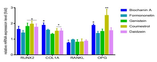 The influence of 14 days of exposure of isoflavones on the expression of genes in Saos-2 cells. The expression levels of RUNX2, COL1A, RANKL, OPG were quantified by real-time PCR and normalized using glyceraldehyde-3-phosphate dehydrogenase (GAPDH) as a reference gene. Control cells were not exposed to any compound but the vehicle; values are means ± standard deviations, n ≥ 3; statistical significance was calculated versus control cells (untreated), * p ≥ 0.05, ** p ≥ 0.01.