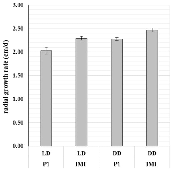 Strain-specific differences in radial growth of Trichoderma atroviride. The radial growth rate (cm/d) of T. atroviride P1 (P1) and IMI 206040 (IMI) after three days of cultivation on PDA at 25 °C under light-dark (LD) conditions or complete darkness (DD). Results shown are means ± SD (n = 4).