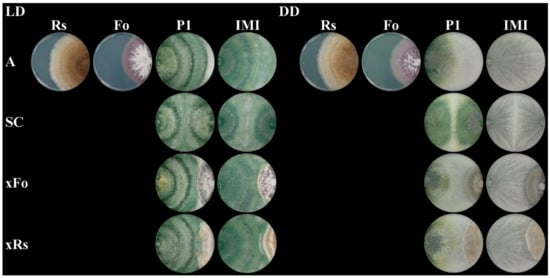 Strain-specific differences in the mycoparasitic behavior against Fusarium oxysporum and Rhizoctonia solani upon incubation under different light regimes. Plate confrontation assays of the mycoparasites T. atroviride P1 (P1) and T. atroviride IMI 206040 (IMI) against the host fungi F. oxysporum (Fo) and R. solani (Rs). As controls, all strains were grown alone (A). The mycoparasites were as well grown in self confrontation (SC) and in direct confrontation with F. oxysporum (xFo) or R. solani (xRs) on PDA at 25 °C for five days under either light-dark (LD) conditions or complete darkness (DD). A representative image of four biological replicates (n = 4) is shown.