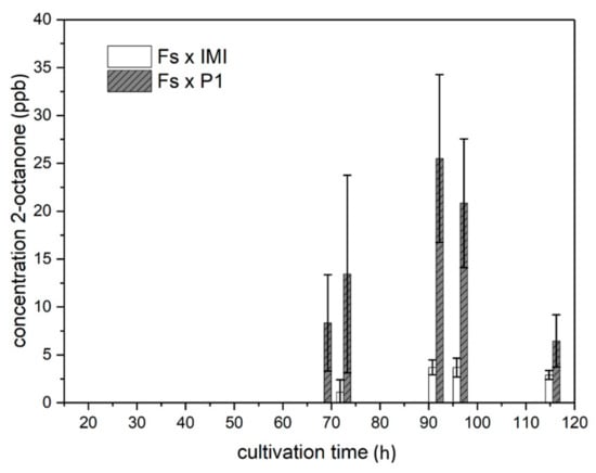 Similar to axenic cultivation, 3-octanone was solely produced in the presence of light by strain IMI 206040, irrespective of the presence of F. oxysporum. In axenic cultures, 3-octanone release increased over the whole cultivation period. In contrast, co-cultivation with F. oxysporum resulted in maximal 3-octanone production after 91.5 h, although 3-octanone levels were about 50% reduced compared to axenic cultivation. A massive reduction in 3-octanone emission upon interaction with F. oxysporum was also evident in strain P1, especially upon cultivation in darkness. However, 3-octanone production in co-culture was triggered by light as strain P1 produced nearly the double amount of this volatile in co-culture with F. oxysporum under light-dark conditions compared to constant darkness (Figure 8; row 3).
