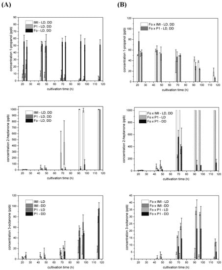 When grown in axenic culture, F. oxysporum constantly released approx. 55 ppb 1-propanol in a light-independent manner, whereas 2-heptanone, 3-octanone, and 2-octanone could not be detected under these conditions. However, confrontations of both T. atroviride strains with F. oxysporum led to the release of 2-octanone, which was not produced under any other condition tested in this study. Interestingly, 2-octanone emission during co-cultivation of strain P1 with F. oxysporum was significantly higher compared to the IMI 206040—F. oxysporum pairing. 2-octanone release started after 68.5 h of growth, peaked after 91.5 h with approx. 25 ppb in the co-culture involving strain P1 and with 4 ppb in the co-culture with strain IMI 206040 and afterwards decreased again (Figure 7). 1-propanol levels were increased, especially between 68.5 and 96.5 h of growth upon co-cultivation of T. atroviride P1 or IMI 206040 and F. oxysporum compared to the respective axenic cultures. In contrast to axenic cultures, which peaked between 40 and 50 h of cultivation, all co-cultivations with F. oxysporum resulted in high initial levels, which then constantly decreased over the cultivation period. (Figure 8; row 1).