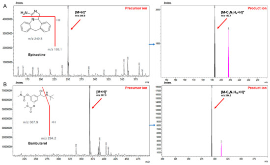 Positive product ion mass spectra in UPLC-MS/MS quantification; (A) epinastine; (B) bambuterol (IS). IS: internal standard.