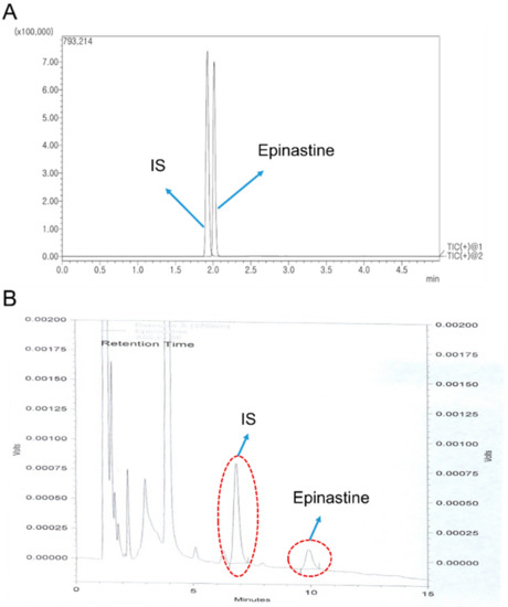 Representative chromatograms of epinastine and IS in MRM (multiple reaction monitoring) positive mode of UPLC-MS/MS (A) and HPLC-UV (B) method in human plasma.