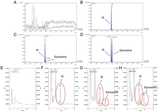 Selectivity was shown in the response of the blank human plasma (Figure 3A,E), zero plasma containing the IS (Figure 3B,F), blank plasma containing LLOQ epinastine and IS (Figure 3C,G), and the plasma sample at 2 h after oral administration of epinastine hydrochloride tablet (Figure 3D,H). The representative chromatograms are presented in Figure 3, indicating no significant interferences from the endogenous substances around the retention times of analytes in blank plasma in both methods.