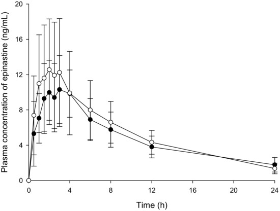 - Sarashina, A.; Tatami, S.; Yamamura, N.; Tsuda, Y.; Igarashi, T. Population pharmacokinetics of epinastine, a histamine H1 receptor antagonist, in adults and children. Br. J. Clin. Pharmacol. 2005, 59, 43–53. [Google Scholar] [CrossRef]