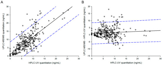 Comparative analysis of samples using HPLC-UV (x-axis) and UPLC-MS/MS (y-axis) (A), and correlation of the method differences between HPLC-UV (x-axis) and UPLC-MS/MS – HPLC-UV (y-axis) (B). The straight line represents the linear regression line, and the dashed line shows a 95% prediction interval line.