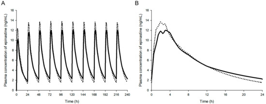 Simulation (mean value) graphs of multiple doses based on single-dose (mean) data of epinastine hydrochloride obtained using HPLC-UV (straight line) and UPLC-MS/MS (dashed line); (A) multiple simulation graph pattern; (B) estimated PK (pharmacokinetic) graph from 0 to 24 h at steady-state.
