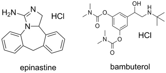 Chemical structures of epinastine hydrochloride and bambuterol hydrochloride (internal standard).