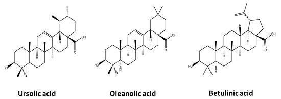 Eucalyptus species are amongst the most commonly used species by the pulp industry in South Western Europe (Portugal and Spain), South America (Brazil and Chile), South Africa, Japan, among others [9]. E. globulus is the dominant species used in Portugal due to its high productivity and high quality of the pulp fibers produced [10]. However, Eucalyptus by-products could be further valorized if high value compounds could be extracted prior to their energy conversion. It has been reported that several Eucalyptus species outer barks contain large amounts of triterpenic acids (TTAs), such as ursolic (UA), betulinic (BA) and oleanolic (OA) acids [11,12,13,14] (Figure 1), which display relevant biological activities, such as antimicrobial, antitumor, hepatoprotective, anti-inflammatory, cytotoxic, anti-allergic and anti-HIV activities [15,16,17,18,19,20,21]. Accordingly, these high value compounds have been studied in a wide range of applications in the food, biomedical and pharmaceutical fields [22,23,24].