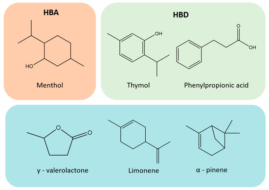 Based on the exposed, and given our interest on the exploitation of triterpenic acids from E. globulus outer bark [11,12,28,42], herein we investigated hydrophobic (NA)DES for the extraction of TTAs. TTAs have a negligible solubility in water (1.02 × 10−7 g/L) [43], and as mentioned above, their extraction is usually performed with organic solvents. Nevertheless, the solubility of UA in some of these solvents is not higher than 15 mg per g of solvent [44,45]. Thus, given the hydrophobic nature of TTAs, hydrophobic NADES can be envisioned as promising alternative solvents. In this work, menthol is considered the HBA while thymol and phenylpropionic acid were the HBDs (Figure 2). Firstly, this study comprised a solubility study of ursolic acid (the most abundant TTA in E. globulus outer bark) in the selected NADES, at different molar ratios and temperatures, followed by the application of the optimal conditions to the extraction of TTAs from E. globulus outer bark. To demonstrate the improved efficiency provided by NADES in the UA solubility studies, the individual components of the studied NADES were also investigated, along with γ-valerolactone, limonene and α-pinene (Figure 2), which are bio-based solvents that have already demonstrated their efficiency in the extraction of triterpenes from other biomass sources [46]. The extractions were optimized regarding the DES molar ratio, biomass/DES ratio and temperature.