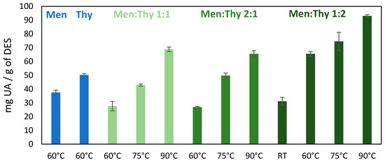 Since pure thymol has shown the highest solubility of UA, followed by menthol and the menthol:thymol 1:1 NADES, a study on the effect of different ratios of the two monoterpenes in the NADES composition was conducted, according to solid-liquid phase diagrams reported elsewhere [47,48]. Specifically, the solubility of UA was carried out in NADES with two different molar ratios of menthol:thymol (namely, 1:2 and 2:1), at different temperatures (RT, 60, 75 and 90 °C), whose results are shown in Figure 4.