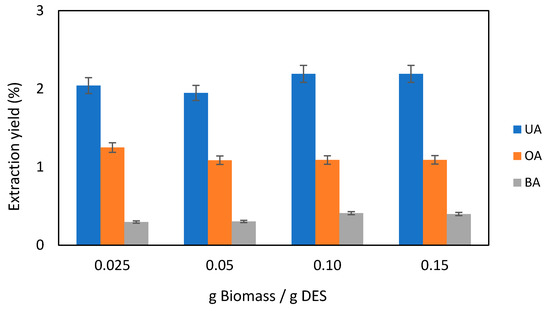 First, the biomass/DES ratio was studied in order to appraise the maximum quantity of biomass that could be used without compromising the extraction yields due to mass transfer or saturation effects, going from 0.025 up to 0.15 g of dried biomass/g of solvent, at the following fixed conditions: 90 °C; stirring of 500 rpm, 4h. It was found that above 0.15 g/g the extraction medium becomes highly viscous and difficult to operate. From the results depicted in Figure 5, the total TTAs extraction yield ranges between 3.4 and 3.7 wt%, which is significantly higher than those obtained previously with supercritical CO2 (1.2%) [11] and dichloromethane (1.4%) [12] from the same biomass. Furthermore, the extraction yields are not compromised by the increased amount of biomass up to 0.15 g/g, meaning higher amounts of TTAs extracted per mass of solvent, a crucial factor for implementing efficient industrial processes. In terms of each TTA, UA was, as expected, the most abundant component (2.0–2.2 wt%), followed by OA (1.1–1.3 wt%) and BA (0.30–0.41 wt%). An illustrative HPLC chromatogram corresponding to TTAs rich extract obtained using the NADES menthol:thymol 1:2 at 90 °C (0.15 g/g) is provided in Figure S1 (Supplementary Materials).