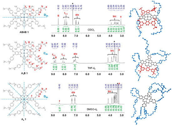 1H NMR spectra for ABAB-1 (in CDCl3), A3B-1 (in THF-d8) and A4-1 (in DMSO-d6). Geometry optimization (MM2, SCIGRESS (FJ 2.8.1 EU 3.3.1)) for each molecule is shown.
