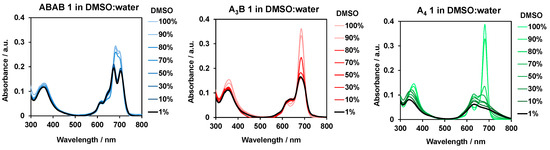 UV–Vis spectra of ABAB-1, A3B-1, and A4-1 in different DMSO/water ratios.