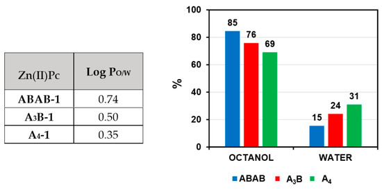 For a preliminary evaluation of the relative lipophilicity of ABAB-1, A3B-1, and A4-1, and their affinity for cell membranes, n-octanol/PBS partition coefficients were determined using the shake-flask method (see Figure S9), which does not require standard compounds and is based on the direct determination of equilibrium partition concentrations of a compound in a biphasic system. Although the three compounds have a common structural Pc core, they exhibited different amphiphilic character. ABAB-1 renders a higher octanol/water partition coefficient than A3B-1 and A4-1, (see Figure 3), for [Zn(II)Pc] = 10−5 M in the octanol/water mixture (%DMSO < 1%), thus indicating the relative order of lipophilicity nature. In fact, the log PO/W values suggest that ABAB-1 and A3B-1 are mostly hydrophobic and have very high affinity for membranes. On the other hand, A4-1 is more amphiphilic, and its presence in the aqueous phase is more abundant, which is concordant which its higher solubility in this medium.