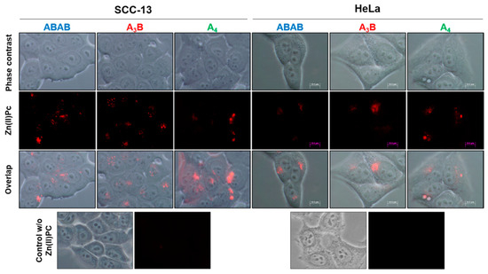 To localize the Zn(II)Pcs in the treated cells, they were irradiated with green light (545 nm) with a BP545 filter. In Figure 5 we can see that ABAB-1, A3B-1, and A4-1 are located inside the cells. They appear with a vesicular morphology and they are probably localized in lysosomes or endosomes, which suggest that they are internalized through an endocytic pathway. Unfortunately, the fluorescence of these Zn(II)Pcs is too weak to be appreciated if specific probes for each organelle are used, which fluorescence mask the emission of the Zn(II)Pcs. For the sake of comparison, we are including in Appendix A (Figure A1) images of subcellular localization of organelles for SCC-13 and HeLa cells after incubation with known fluorescent probes.