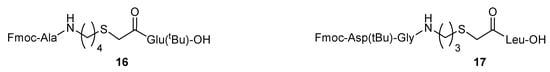 In brief, amino acid couplings were achieved by using 1-hydroxybenzotriazole/N,N′-diisopropylcarbodiimide (HOBt/DIC) in N-methyl-2-pyrrolidone (NMP). As the N-Fmoc aminothiols 6, the corresponding N-Fmoc aminobutanethiol and N-Fmoc aminopropanethiol derivatives were used. Both thioether containing peptides (16 and 17) were prepared in high yield (87 and 90% yield, respectively) and purity (95 and 98%, respectively) as confirmed by hplc analysis (see Figure S1 in Supplementary Materials section), revealing that these methods could be used for the preparation of larger thioether containing peptides. The correct mass of peptide analogues 16 and 17 was determined by ESI-MS analysis (16: [M + H] calc.: 641.28; found: 641.42 and 17: [M + H] calc.: 712.31; found: 712.56). In this method, although the thioether formation between the N-Fmoc aminothiol 6 and the haloacylated peptide 12 proceeds relatively fast, the fragment coupling of the resin-bound N-Fmoc deprotected thiol-peptide 13 with the N-Fmoc peptide fragment 14, proceeds slowly (6–12 h) and in some cases is incomplete, similarly to route A.
