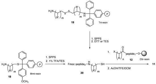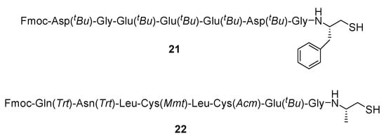 Regarding the synthesis of the thiol-peptide fragment 20, in case that acid sensitive (cleaved under acidic solutions ≤1% TFA) amino acid side chain protecting groups are needed in the peptide sequence, we suggest its synthesis through reductive cleavage from resin 19, instead of its acidic cleavage from resin 18 (by which the acid labile protecting group would be cleaved).