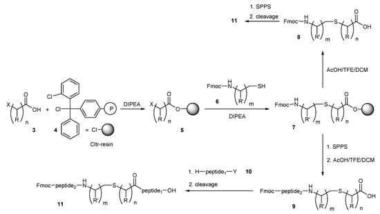Route C for CSPPS of thioether containing peptides. The thioether containing peptides were obtained by the condensation of a haloacylated peptide which was synthesized on Cltr-resin and a thiol-peptide which was synthesized either on Mmt-resin, or on Trt-resin; R = H (n = 1–5), CH3 (n = 1); R′ = H (m = 1–5), CH3, CH(CH3)2, CH2CH(CH3)2, CH(CH3)CH2CH3, CH2(C6H5) (m = 1); X = Cl, Br.