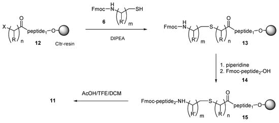 3.3.6. General Procedure for the Condensation of N-Fmoc Aminothiols or N-Fmoc Thiol-Peptides with Resin-Bound Haloacids