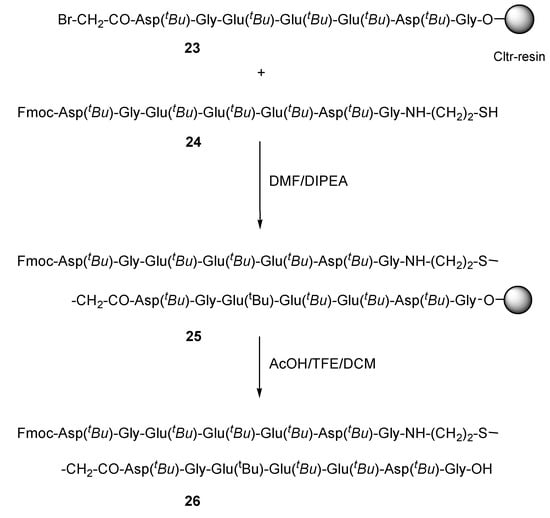 As an example of the final step of our strategy for the synthesis of thioether containing peptides 11 by route C, we present the synthesis of the cysteamine derivative 26, which is composed by two prothymosin a segments (ProTa (69-75)) linked by a thioether bond (Scheme 4). For this synthesis, the resin-bound bromoacetylated peptide 23 was initially prepared on Cltr-resin by using standard SPPS methods (Fmoc/tBu method and HOBt/DIC for the amino acid activation). Then a two-fold molar excess of 24 was condensed with 23 in DMF/DIPEA for 10 min at room temperature (Scheme 4). The resin 25 was treated with AcOH/TFE/DCM (1:2:7) and the protected peptide 26 was obtained in 90% yield and 92% purity according to HPLC analysis (see Figure S4 in Supplementary Materials section). The correct mass of the obtained peptide 26 was determined by ES-MS analysis ([M + 2H] calc.: 1191.60; found: 1191.80).