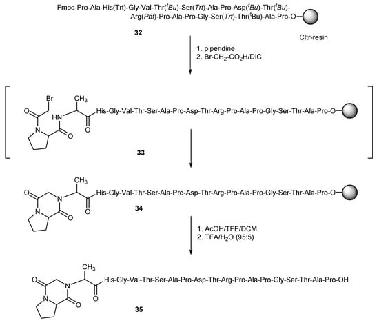 In case of haloacetyl-peptides, which contain various strong nucleophiles, one should be aware of possible side reactions of the nucleophiles with the haloacetyl moiety. This is a well-known problem especially for bromoacetylated-methionine (Met)-peptides [31,32,33]. In this work we found similar instability issues for bromoacetylated-proline (Pro)-peptides. As an example, resin-bound MUC-1 32 was treated with piperidine to liberate the N-terminus of the peptide sequence and this was reacted with a three-fold molar excess bromoacetic acid and DIC in NMP (Scheme 6). After cleavage of the obtained peptide from the resin and deprotection with TFA/water (95:5) for 3 h at room temperature, the main product of the synthesis, instead of the expected haloacylated peptide, was a product with a molecular mass [M − 81] ([M − 81 + 2H]: calc.: 963.97; found: 964.09). This corresponds to a peptide with one less HBr, which was attributed to the diketopiperazine peptide derivative 35, obviously prepared by the nucleophilic attack of the N-terminus group of alanine to the carbon atom that bears the bromine. This nucleophilic attack is possibly favored by the proximity of these atoms, which is due to the presence of proline just before the haloacid in the peptide chain (Scheme 6).