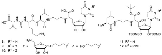 It was also attempted to synthesize and study analogues bearing the aminoribosyl substituent (X in Figure 1) at different positions of the muraymycin scaffold. This led to compounds 9 and 10 (with 10 serving as a reference, Figure 3) which were modified at the N-3 position of the uracil base. However, these analogues showed no inhibitory activity against MraY [24]. Remarkably, previously reported simplified analogues 11 and 12 (which still contained synthetic TBDMS and, in case of 12, PMB protecting groups, Figure 3) had been described to be antibacterially active MraY inhibitors, in spite of the modification of the uracil base in compound 12 [34].