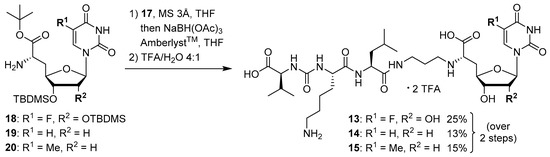 The synthesis of the peptide-aldehyde unit 17, based on a solid phase-supported approach, has been performed as recently reported [42]. Thus, the stage was set for the preparation of target structures 13–15 (Scheme 4). Nucleosyl amino acids 18–20 were connected with peptide-aldehyde 17 by reductive amination. This transformation had been described before as a key step in the synthesis of muraymycin analogues [24,31,38]. Subsequent global acidic deprotection using 80% aqueous TFA and HPLC purification afforded target compounds 13–15 as their bis-TFA salts in 13%–25% yields over two steps from 18–20 (Scheme 4).