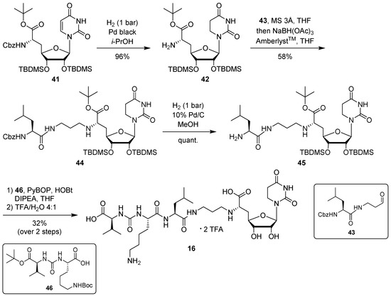 Introduction of the propyl linker and the leucine moiety was achieved by reductive amination of 42 with aldehyde 43 [24,34], furnishing 44 in 58% yield (Scheme 5). After hydrogenolytic Cbz cleavage (product 45, quantitative yield), urea dipeptide building block 46 [24,41] was employed in a peptide coupling step to construct the full-length muraymycin scaffold. This was followed by global acidic deprotection and HPLC purification to give target compound 16 (as its bis-TFA salt) in 32% yield over two steps from 45 (Scheme 5).