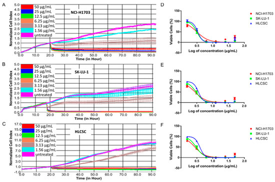 To check whether the growth-inhibitory effect of chelerythrine chloride is applicable to major histological cell types of NSCLC, we used three cell lines consisting of squamous cell carcinoma, adenocarcinoma, and lung CSC cell lines. Using a real-time cell analyzer (RTCA) that evaluates cell viability based on impedance to detect cell attachment, we evaluated chelerythrine chloride’s growth-inhibitory kinetic in NCI-H1703, SK-LU-1, and HLCSC. HLCSC was certified by endorsing companies to exert cancer stem cells properties, including markers expressions (CD133, aldehyde dehydrogenase (ALDH), stage-specific embryonic antigen 3/4 (SSEA3/4), alkaline phosphatase, octamer-binding transcription factor 4 (OCT4) and CD43), and in vivo tumorigenicity (<1000 cells). Figure 1 shows dose–response kinetic curves and dose–response curves for 24, 48, and 72 h treatment of chelerythrine chloride in the three cell lines. The treatment kinetic of chelerythrine chloride always started with rapid initial cytotoxicity indicated by curves with negative gradient, and this cytotoxic effect was more pronouncedly seen in mid-range (6.25 and 12.5 μg/mL) to high-treatment concentrations (25 and 50 μg/mL) in all three cell lines (Figure 1A–C). Growth arresting activity (flat curve) was observed as the after-effect of treatment in mid-range to high concentrations. A closer look at specific time-points after 24 h treatment intervals, NCI-H1703, SK-LU-1, and HLCSC were almost equally sensitive toward chelerythrine chloride at all treatment concentrations (Figure 1D–F). However, minor sensitivity observation from the dose–response curves deduced that NCI-H1703 was slightly more sensitive to 1.56 μg/mL of chelerythrine chloride when compared to SK-LU-1 and HLCSC. This difference can be more clearly seen in differences of IC20, IC50, and IC80 values of chelerythrine chloride among the cell lines (Table 1). Interestingly, NCI-H1703 was slightly more resistant at higher treatment concentrations indicated by slightly higher IC80 values. All in all, chelerythrine chloride is a potent growth inhibitor of major histologies of NLCSC.