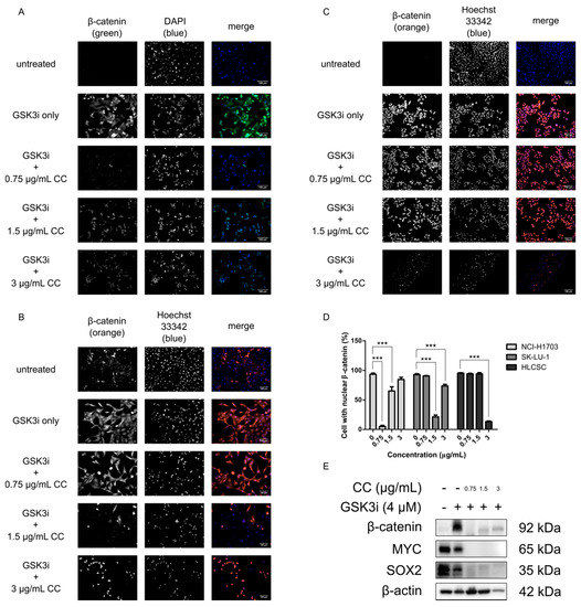 NCI-H1703, SK-LU-1, and HLCSC were first treated with glycogen synthase kinase 3 inhibitor X (GSK3i) for 24 h upon growing overnight in order to artificially activate the Wnt/β-catenin pathway before the onset of chelerythrine chloride treatment. Immunofluorescence was performed by using Cellomics® Beta-Catenin Activation Kits (Thermo Scientific, Waltham, MA, USA) in accordance with the manufacturer’s protocol or by staining with mouse anti-beta catenin 1 (cat# 610154, BD Biosciences, Franklin Lakes, NJ, USA) and counter-stained with anti-mouse-Alexa Fluor 488 (A-11001, Thermo Fisher Scientific) and DAPI (1:1000 of 2 mg/mL, Sigma-Aldrich). Five random, non-overlapping frames were captured from each well by using Axio Vert.A1 inverted microscope equipped with HXP-120V light source and Axiocam MR R3 camera (Carl Zeiss, Oberkochen, Germany) or EVOS FL cell imaging system (Thermo Fisher Scientific). Cells harboring nuclear β-catenin were manually counted by using Image’s J cell counter plugin and the positive counts were divided by the respective total number of cells in the captured frames to obtain the percentage of cells with positive nuclear β-catenin [58]. Treated samples were compared with untreated Wnt-activated negative control.