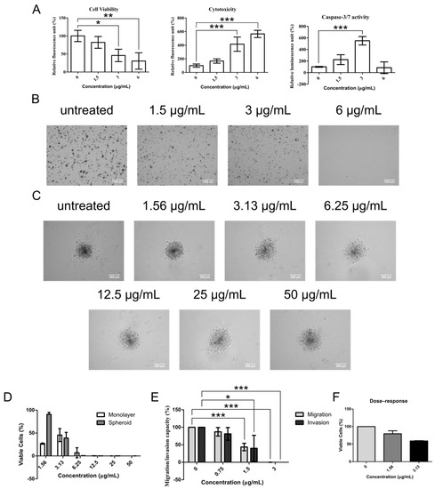 The potential of compounds to inhibit CSC activities is best shown by demonstrating its ability to induce apoptosis and its inhibitory action toward CSC functions. ApoTox-Glo triplex assay was first employed to measure cell viability, cytotoxicity, and late apoptotic activity (caspase-3/7 activity) from the same chelerythrine chloride-treated sets of NCI-H1703 cells. Significant reduction of cell viability was observed in 3 and 6 μg/mL (p < 0.05 and p < 0.01, respectively) of chelerythrine chloride-treated cells (Figure 3A). In parallel with these, cytotoxicity was highly induced in the same treatment groups (p < 0.001). Apoptosis signal was detected in both 1.5 and 3 μg/mL treatment groups, but interestingly, only 3 μg/mL-treated cells displayed an elevated level of apoptosis (p < 0.001). This suggests that chelerythrine chloride may induce other forms of cell death in the 6 μg/mL treatment group.