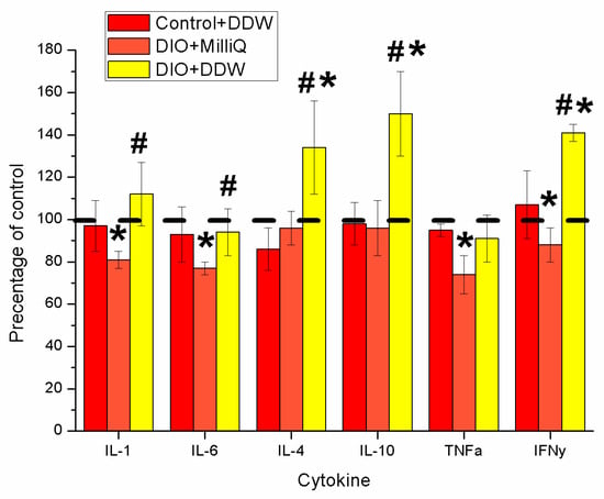 The end-of-experiment serum cytokine profile of control and DIO rats that consumed MilliQ water or DDW. The levels of the studied cytokines are expressed as a percentage of their level relative to those of the Control + MilliQ group, which were set as 100%. * p < 0.05 significantly different from the Control + MilliQ; # p < 0.05 significantly different from the DIO + MilliQ.